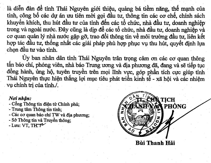 Hội nghị xúc tiến đầu tư năm 2018 tỉnh Thái Nguyên được tổ chức vào ngày 01/7/2018 tại Trung tâm Văn hóa tỉnh Thái Nguyên. Tham dự Hội nghị dự kiến có trên 800 đại biểu gồm: Các đồng chí lãnh đạo Đảng, Nhà nước, lãnh đạo các Bộ, ban, ngành Trung ương; các cơ quan ngoại giao, các tổ chức quốc tế; các chuyên gia về kinh tế; các doanh nhân; các nhà đầu tư trong nước và quốc tế; các cơ quan thông tấn, báo chí, truyền thông trong nước và quốc tế. Dưới đây là Thông cáo báo chí về Hội nghị: