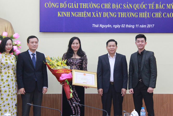 Chị Đỗ Thị Đức Lý, Tổng Giám đốc Công ty CP Chè Tân Cương Hoàng Bình nhận Giải thưởng chè đặc sản Quốc tế Bắc Mỹ năm 2017.