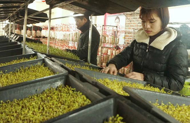 Cơ sở sản xuất của anh Tiến Anh nằm trong một căn phòng rộng chỉ khoảng 300m2. Trong khu nhà ươm mát rượi, hàng trăm giá thể rau mầm cải, mầm rau muống, mầm đậu… được xếp ngăn nắp. Ngắt một nhúm rau trên giá rồi ăn ngon lành, anh Tiến Anh bảo: Rau trồng hoàn toàn bằng phương pháp hữu cơ, không phân hóa học, không thuốc bảo vệ thực vật cũng chẳng chất kích thích nên ăn thoải mái. Với hàng trăm giá thể như thế này, mỗi ngày chúng tôi xuất ra thị trường hàng tạ rau mầm. Tuy vậy, vẫn không đủ để đáp ứng nhu cầu của thị trường.