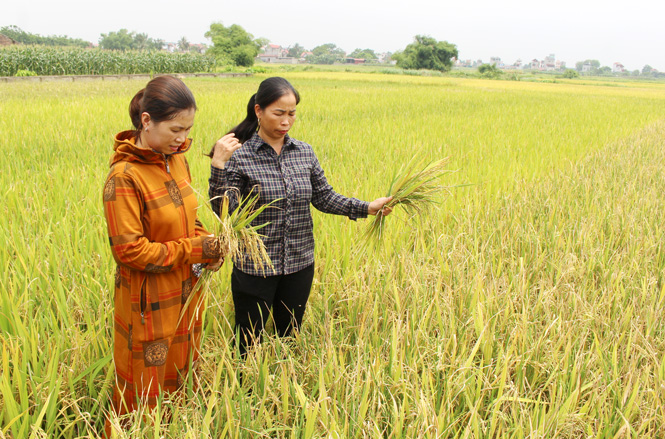 Để chứng minh rõ hơn lời nói của mình, chị Hoa đưa chúng tôi đi thăm cánh đồng xóm Đồng Trong. So sánh giữa 2 thửa ruộng liền kề nhau gieo trồng 2 giống lúa Khang dân 18 và HANA112, nhìn bằng mắt thường, không khó để chúng tôi nhận ra sự khác biệt. Thửa trồng giống Khang dân 18, lúa chín ngả màu vàng óng, bông chắc trĩu hạt, thửa còn lại, bông thì đang trổ, bông lại đâm ngang, bông đang vào hạt, bông lại đang phơi màu… Chị Nguyễn Thị Hiền, người dân xóm Đồng Trong chia sẻ: Nhà tôi cấy 5 sào giống HANA112. Thấy các hộ dân khác trong xã gặt xong, thóc thu về chẳng được bao nhiêu nên tôi đành để lại, cố đợi phần lúa trổ muộn mong thu hoạch được thêm phần nào.