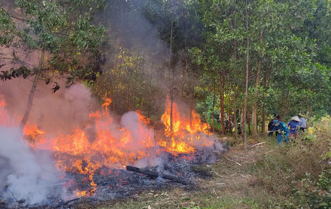Tình huống giả định: Chủ rừng phát dọn, đốt thực bì để canh tác; do thời tiết khô hanh, gió mạnh nên đám cháy bùng phát và có nguy cơ lan sang rừng bên cạnh. Mặc dù chủ rừng và nhân dân xóm Cây Thị đã cố gắng dập lửa bằng các dụng cụ thô sơ nhưng đám cháy vẫn tiếp tục lan nhanh. Về phương án ứng phó: UBND xã chỉ đạo lực lượng chữa cháy rừng theo phương châm 4 tại chỗ kết hợp với lực lượng do Hạt Kiểm lâm huyện tăng cường; tổng quân số tham gia diễn tập khoảng 100 người.