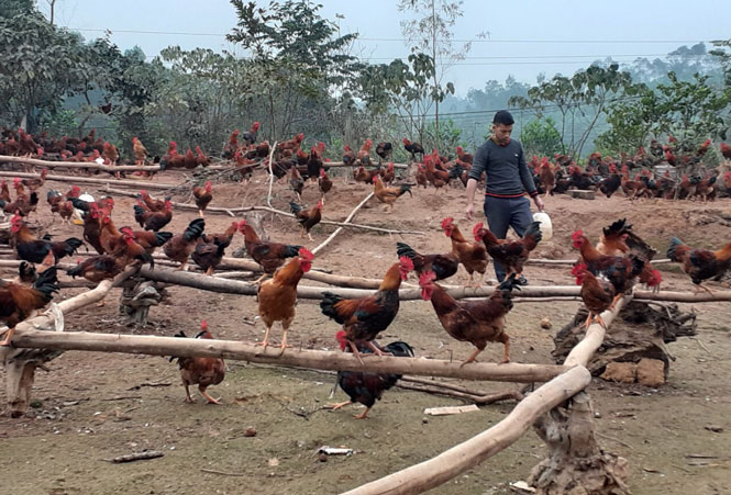 Những ngày này, 10 hộ thành viên trong Hợp tác xã gà đồi Đông Thịnh (xóm Cà, xã Tân Khánh) đều có chung nỗi lo khi lứa gà gần 25.000 con chuẩn bị xuất bán phục vụ thị trường Tết lại bị “rớt giá”. Trao đổi với chúng tôi, ông Nguyễn Văn Thịnh, Giám đốc Hợp tác xã (HTX) cho biết: Xác định dịch COVID-19 sẽ tác động đến thị trường tiêu thụ gà thịt nên năm nay, HTX đã giảm khoảng 10.000 con gà so với quy mô mọi năm. Tuy nhiên, từ tháng 9-2020 đến nay, giá gà xuất bán liên tục giảm, giá gà ta từ 67-70.000 đồng/kg giảm chỉ còn 57.000-60.000 đồng/kg và gà lai từ 50.000-53.000 đồng/kg xuống còn 47.000-50.000 đồng/kg. Trong khi đó, giá thức ăn chăn nuôi lại tăng từ 235.000 đồng lên đến 255.000 đồng/1 bao (25kg). Với giá gà lai như hiện nay, cứ 1.000 con gà thì người chăn nuôi sẽ lỗ khoảng 5-10 triệu đồng (tùy vào các chi phí công tác phòng dịch bệnh, khử trùng). Hiện nay, nhà tôi cũng đang có gần 2.000 con gà đến lứa xuất bán trong tuần tới, tôi hy vọng giá gà sẽ dần tăng lên để hòa vốn.
