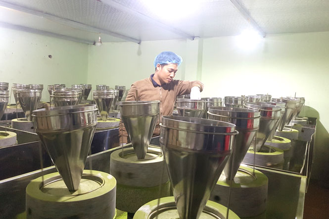 Dẫn chúng tôi đi tham quan khu nhà xưởng với hệ thống máy móc được đầu tư đồng bộ, hiện đại, anh Thắng cho biết: Năm 2014, tinh bột trà xanh Nhật Bản (matcha) xuất hiện trên thị trường, được nhiều người tin dùng trong việc làm đẹp, giảm cân, sử dụng làm hương liệu… Nhận thấy đây là sản phẩm có nhiều tiềm năng để phát triển, trong khi Thái Nguyên có lợi thế là vùng nguyên liệu chè lớn nên tôi nghĩ đến phương án chế biến và phát triển loại sản phẩm này. Suy nghĩ đó đã thôi thúc tôi quyết tâm tìm hiểu, nghiên cứu tạo ra sản phẩm tinh bột trà xanh mang thương hiệu của riêng mình. Ban đầu, tôi mua lại chè búp tươi đã được sao khô của người dân địa phương rồi nghiền thành bột. Tuy nhiên, do chưa có máy móc hiện đại và kỹ thuật còn hạn chế nên độ nhỏ mịn của bột trà xanh chưa được như ý muốn. Vì vậy, tôi đã dành hơn nửa năm đi khắp các tỉnh miền Trung, miền Nam tìm kiếm loại đá phù hợp để chế tạo máy nghiền, đảm bảo tạo ra loại bột mịn mà vẫn giữ nguyên màu sắc tự nhiên cũng như chất lượng sản phẩm.