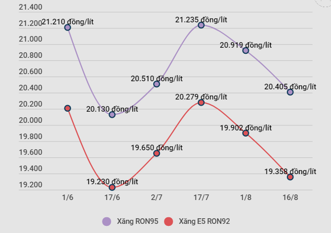 Lần gần đây nhất (ngày 1/8), xăng E5 RON92 chính thức giảm 377 đồng/lít, xăng RON95-III giảm 316 đồng/lít. Trong khi đó, dầu diesel 0,05S tăng 26 đồng/lít, dầu hỏa tăng 7 đồng/lít và dầu mazút 3.5S giảm 53 đồng/kg.