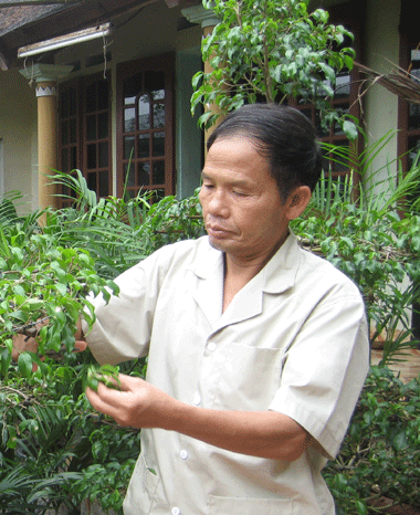 Ngay từ ngoài cổng bước vào, chúng tôi thấy nơi đâu cũng đặt những chậu cây cảnh với đủ các kiểu dáng, chủng loại. Đi trong khu vườn ngợp hoa lá, ông khoe với chúng tôi những chậu vạn tuế, la hán, tùng, xanh cổ thụ… với đủ dáng rồng bay, phượng múa. Ông cho biết: Trồng cây cảnh vốn là niềm đam mê của tôi. Ban đầu cũng chỉ là thú chơi tao nhã, sau có nhiều người hỏi mua, được giá nên tôi bán. Nghề này cho thu nhập cao hơn nhiều so với trồng lúa.