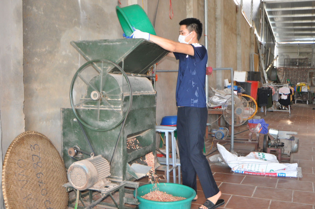 Vừa đổ lạc vào máy bóc vỏ, anh Quang vừa chia sẻ: Tốt nghiệp THPT năm 2011, sau đó tôi đi làm thuê cho các công ty, doanh nghiệp. Đến năm 2016, nghe theo tiếng gọi của Tổ quốc, tôi tham gia nghĩa vụ quân sự. Sau 2 năm hoàn thành nghĩa vụ, trở về địa phương, tôi luôn nghĩ mình phải làm gì đó để sản xuất ra một sản phẩm vừa an toàn lại vừa tốt cho sức khỏe của người dân. Sau một thời gian tìm hiểu, tôi thấy địa phương mình là huyện thuần nông, bà con trồng khá nhiều lạc. Nguyên liệu sẵn có là vậy nhưng người dân lại phải mang lạc đi xa để ép lấy dầu ăn nên tôi đã đến một số tỉnh để học hỏi và quyết làm.