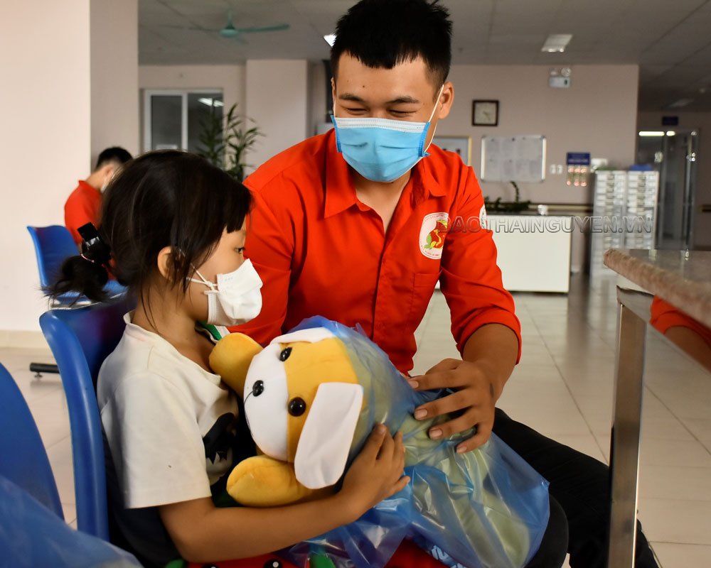 Hoàng Xuân Ngọc tặng quà động viên em Lý Thị Hà Linh mắc bệnh tan máu bẩm sinh, tại Trung tâm Huyết học-Truyền máu (Bệnh viện Trung ương Thái Nguyên).