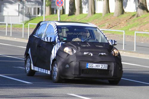 Các tay săn ảnh chụp trộm khi Morning (có tên Picanto khi xuất khẩu) chạy thử trên đường đua Nurburgring, Đức. Kia phát triển sản phẩm tại châu Âu giống như hãng mẹ Hyundai, nhằm tiếp cận tốt hơn với khách hàng ở thị trường khó tính này.