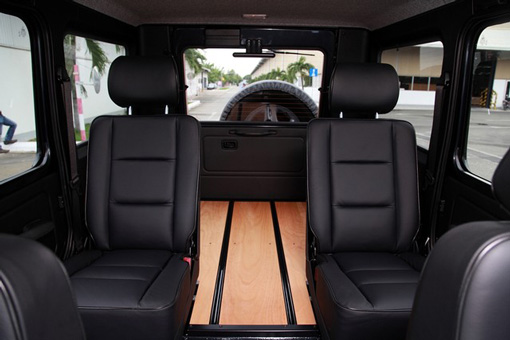 Sàn khoang hành lý của Mercedes-Benz G300 CDI Professional "Edition PUR" được ốp gỗ. Tiếp đến là giá để đồ trên nóc xe tiện dụng. Xe được cung cấp bình nhiên liệu có dung tích gần 100 lít, đảm bảo tính liên tục cho những chuyến đi đường trường.