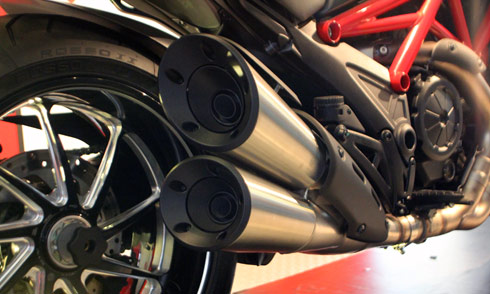 Diavel vẫn sử dụng loại ống xả 2-1-2 với đường ống 2,28 inch, nhưng ống xả thép không gỉ cơ bắp được làm mới, tạo hình góc cạnh để phù hợp với bánh xe phía sau.
