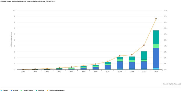 Việc nhiều nhà sản xuất ô tô bất ngờ tuyên bố quyết tâm “xanh hóa” dải sản phẩm lúc này là điều dễ hiểu, khi những thống kê về thị trường năm 2021 bắt đầu được công bố, cho thấy sự bùng nổ doanh số của loại hình phương tiện mới. Theo báo cáo của IEA, năm 2021, chứng kiến thị phần ô tô điện toàn cầu đạt 8,57%, tăng hơn gấp đôi con số 4,11% của năm 2020.