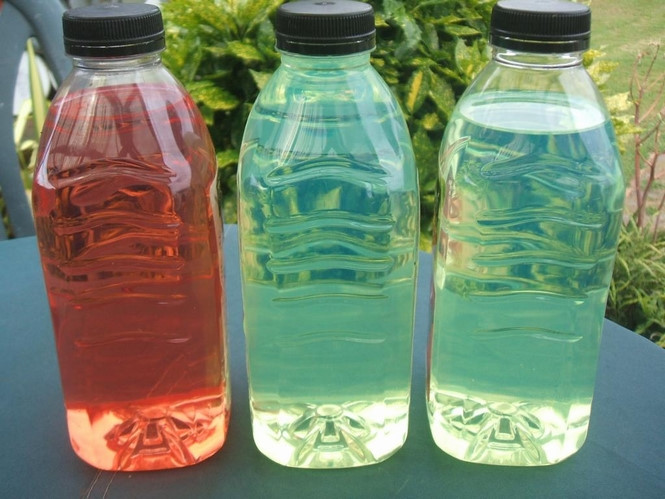 Từ trái sang Xăng A83 (đỏ), E5 A92 (xanh) và A92 (xanh nhạt) có màu khác hẳn nhau