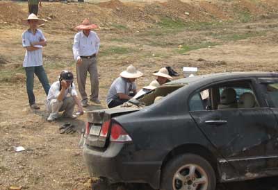 Khám nghiệm hiện trường cho thấy chiếc ôtô nhãn hiệu Honda Civic màu đen bị hư hỏng khá nặng ở phần đầu và sau xe. Với vị trí tai nạn có thể nhận định chiếc xe đang đi chiều từ Hà Nội đi Hòa Lạc, sau khi đâm vào dải phân cách, rồi "bay" sang rìa đường phía bên kia. Kiểm tra chiếc xe, thu giữ 1 khẩu súng kíp, 1 khẩu súng ngắn cùng một số dao nhọn. 2 túi khí phía trước đều bị bung, ghế trước và ghế sau có dính máu. Kính xe phía sau bị vỡ toàn bộ, cửa kính phía bên lái xe có thủng một lỗ bằng miệng bát, các cửa kính khác còn nguyên vẹn.