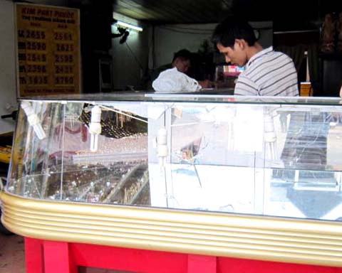 Theo ghi nhận của VnExpress.net tại hiện trường, mặt trước tủ kính trưng bày nữ trang vàng có độ dầy khoảng 8 mm bị đập bể nát, kính vương vãi khắp nơi. Tiệm vàng này nằm gần ngã tư Tân Kỳ-Tân Quý và Trường Chinh. Đây là khu dân cư buôn bán sầm uất, tấp nập người qua lại.