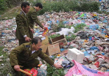 Vào hồi 15h30' ngày 26/11, tại Bãi rác thị trấn Đình Cả, Hội đồng tiêu huỷ tang vật hàng hoá huyện Võ Nhai đã tiến hành tiêu huỷ toàn bộ số hàng hoá nhập lậu, không rõ nguồn gốc, hàng giả, hàng kém chất lượng đã hết hạn sử dụng do Đội Quản lý thị trường huyện tịch thu hồi 6 tháng cuối năm 2009 và năm 2010 (ảnh).