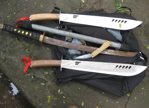 Kiểm tra xe này, Công an huyện Từ Liêm phát hiện hai thanh đao, một thanh kiếm và một dao nhíp... do những người đi xe taxi để lại.