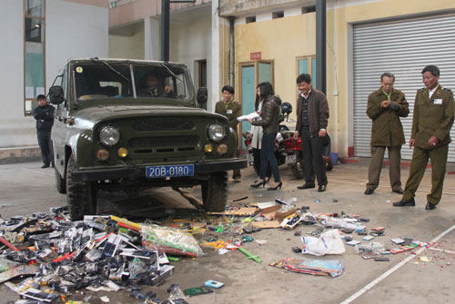Chiều 29-12, Đội Quản lý thị trường T.P Thái Nguyên đã tổ chức tiêu hủy 11 loại mặt hàng quá hạn sử dụng, hàng cấm, đồ chơi trẻ em mang tính chất bạo lực như: Pháo nổ (36 quả), máy tính casio (88 chiếc), kiếm nhựa (65 cái), thuốc lá 555 (2.000 bao)…., ước tính số hàng trên trị giá trên 90 triệu đồng. Đây là số hàng Đội Quản lý thị trường T.P Thái Nguyên kiểm tra bắt giữ trong năm 2011 (ảnh).