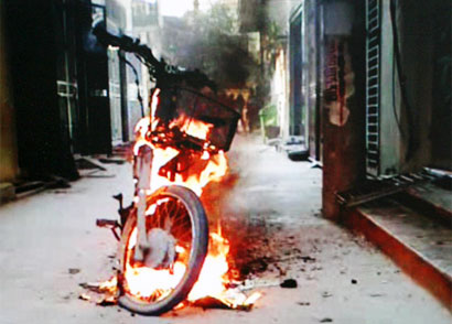 Sáng 26/12, chiếc xe máy sản xuất tại Trung Quốc của anh Trịnh Đức Sơn ở phường Mai Động (Hoàng Mai, Hà Nội) bùng cháy ngay trước cửa nhà khi vừa khởi động.