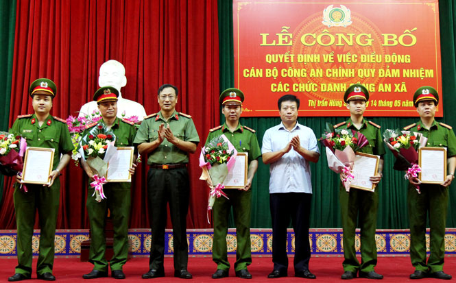 Lãnh đạo Công an tỉnh, UBND huyện Đại Từ trao quyết định và tặng hoa chúc mừng các cán bộ, chiến sĩ công an chính quy được điều động, bố trí đảm nhiệm các chức danh công an xã tại thị trấn Hùng Sơn (tháng 5-2019).