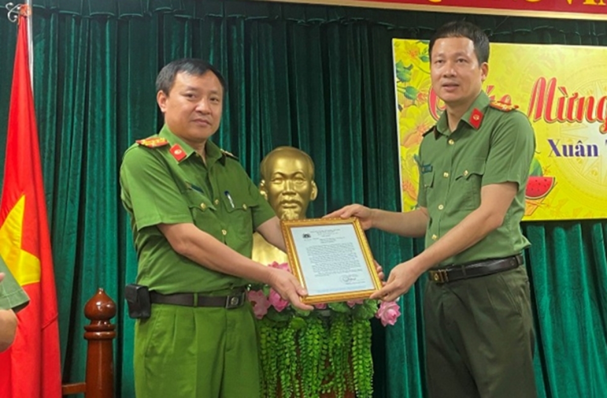 Thừa ủy quyền của Bộ trưởng Bộ Công an, Đại tá Vũ Hồng Văn, Giám đốc Công an tỉnh Đồng Nai trao thư khen của Bộ Công an cho Trưởng ban chuyên án.