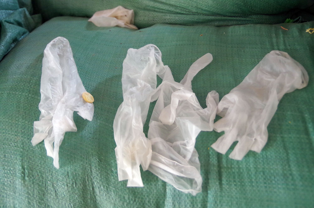 Tại đây, lực lượng chức năng phát hiện nhiều bao tải dứa, nilon bên trong đựng rác thải là găng tay nhựa, cao su đã qua sử dụng. Cụ thể gồm: 3.940kg găng tay đã qua sử dụng đã được phân loại; 6.470kg găng tay đã qua sử dụng chưa được phân loại và 3.130kg rác thải là các đầu bao tay của găng tay đã qua sử dụng. Tổng khối lượng rác thải là 13.540kg.