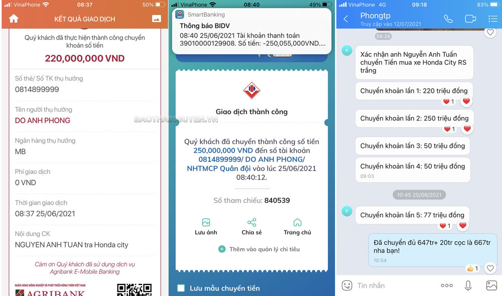 Theo đó, ngày 5-5-2021, anh Tuấn đến xem xe tại Đại lý Honda ô tô Thái Nguyên và đặt cọc số tiền 20 triệu đồng cho nhân viên kinh doanh Nguyễn Nam Trung. Hơn 1 tháng sau, khi nhận được thông báo đã có xe về Đại lý, anh Tuấn tiếp tục đến xem và chụp ảnh sản phẩm; đồng thời được hướng dẫn và đã chuyển toàn bộ số tiền mua xe Honda City RS là 667 triệu đồng vào tài khoản cá nhân của Giám đốc Đại lý Đỗ Anh Phong.