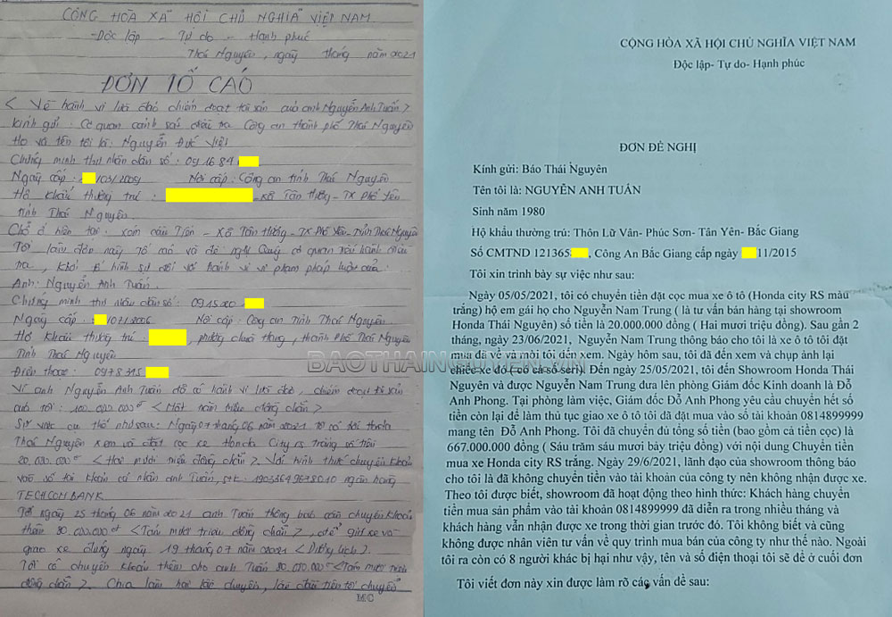 Một trường hợp khác, anh Nguyễn Đức Việt (ở xóm Cầu Tiến, xã Tân Hương, T.X Phổ Yên) cũng có đơn tố cáo nhân viên bán hàng của Honda ô tô Thái Nguyên.