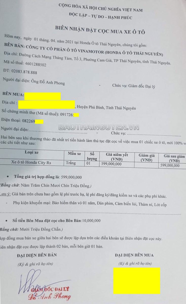 Ví dụ, một biên bản đặt cọc xe có ghi rõ: Đại diện bên bán là Honda ô tô Thái Nguyên, có mã số thuế, tên người đại diện là ông Đỗ Anh Phong - Giám đốc Đại lý, cùng thỏa thuận về số tiền đặt cọc, giá bán và các điều khoản khuyến mại đi kèm. Hợp đồng có chữ ký và đóng dấu chức danh Giám đốc Đại lý… Cách làm này khiến nhiều khách hàng tin tưởng chấp nhận ký thỏa thuận.