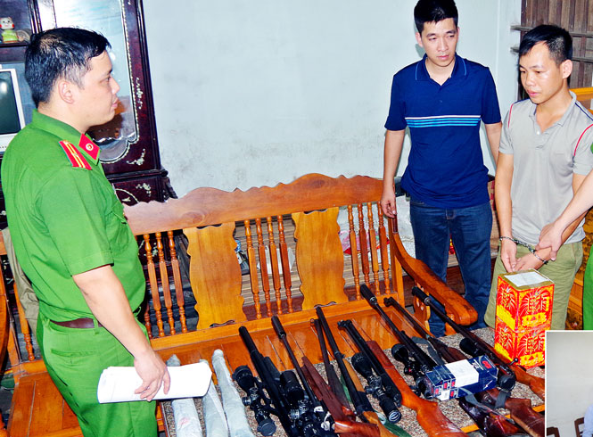 Cán bộ, chiến sĩ Phòng Cảnh sát Hình sự bắt giữ đối tượng Hoàng Văn Điệp, sinh năm 1985, trú tại xã Bản Ngoại, huyện Đại Từ về hành vi mua bán, tàng trữ trái phép vũ khí quân dụng. Ảnh; N.M