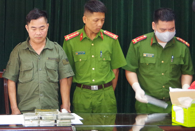 Lực lượng Công an tỉnh phá chuyên án PC04, bắt giữ đối tượng Lý Văn Tạ (đứng ngoài cùng bên trái), sinh năm 1971, trú tại xã Lam Vỹ (Định Hóa), thu giữ 7 bánh heroin có khối lượng trên 2,4kg.