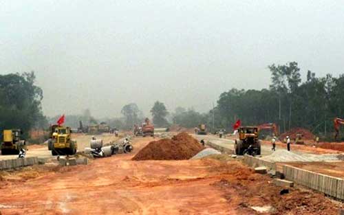 Các phương tiện máy móc của Tổng Công ty Xây dựng Trường Sơn tập trung lu lèn, xử lý nền đất yếu trên các đoạn đường.