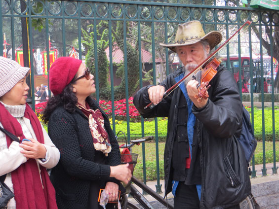Biểu diễn văn nghệ ngẫu hứng ngay tại sân Văn Miếu Quốc Tử Giám.