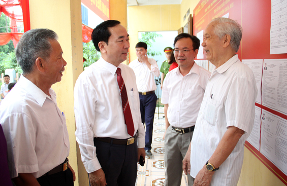 Trong ngày bầu cử, Ban Chỉ đạo bầu cử tỉnh đã tổ chức nhiều đoàn đi kiểm tra, chỉ đạo, tổ chức thực hiện để cuộc bầu cử diễn ra đảm bảo dân chủ, bình đẳng, đúng pháp luật, an toàn và tiết kiệm. Trong ảnh: Đồng chí Vũ Hồng Bắc, Phó Bí thư Tỉnh ủy, Chủ tịch UBND tỉnh đến kiểm tra công tác bầu cử tại xã Tân Hương, huyện Phổ Yên.