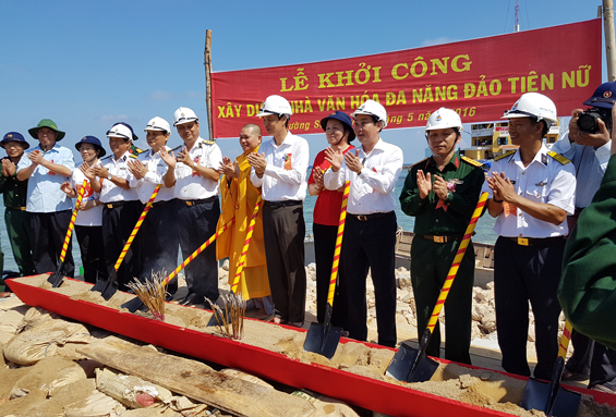 Nhằm chia sẻ với quân và dân trên quần đảo Trường Sa, nhiều tổ chức, địa phương, đơn vị trong đất liền đã có sự quan tâm thiết thực, hỗ trợ bằng các việc làm cụ thể. Trong ảnh: Đoàn công tác tham dự buổi khởi công Nhà văn hóa đa năng trên đảo Tiên Nữ, công trình do Đảng bộ, chính quyền và nhân dân thành phố Hà Nội hỗ trợ với mức đầu tư trên 35 tỷ đồng.