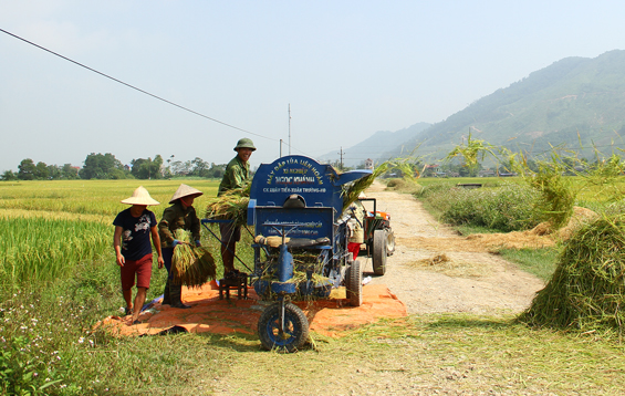 Nhờ tích cực áp dụng khoa học kỹ thuật vào đồng ruộng, nông dân trong xã liên tục có những vụ mùa bội thu. Ảnh: Thu hoạch lúa mùa tại xóm Chuối, xã Ký Phú.