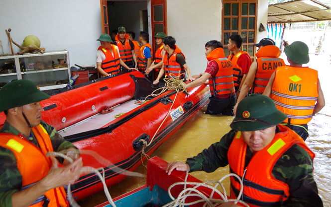 Lực lượng công an, quân đội đưa người dân xóm 14, xã Tân Linh, Đại Từ ra khỏi vùng lũ.