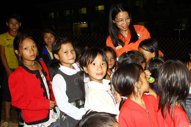 Khoảnh khắc thư giãn của thành viên đoàn khi được vui đùa cùng các học sinh bán trú trường Tiểu học Dế Xu Phình