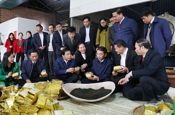 Nhiều năm trở lại đây, áp dụng quy trình làm chè VietGAP, UTZ nhiều cơ sở kinh doanh, gia đình sản xuất chè ở Tân Cương đã đầu tư nhà xưởng, thiết bị chế biến chè hiện đại. Trong ảnh: Các đại biểu thăm khu vực sản xuất của cơ sở chế biến chè Thắng Hường, xóm Hồng Thái 2, xã Tân Cương.