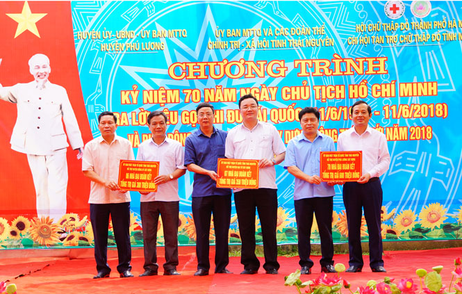 Các đồng chí lãnh đạo tỉnh trao biển tượng trưng hỗ trợ xây dựng 120 Nhà Đại đoàn kết cho các hộ nghèo các huyện Phú Lương, Phú Bình, Đại Từ, Đồng Hỷ , T.X Phổ Yên.
