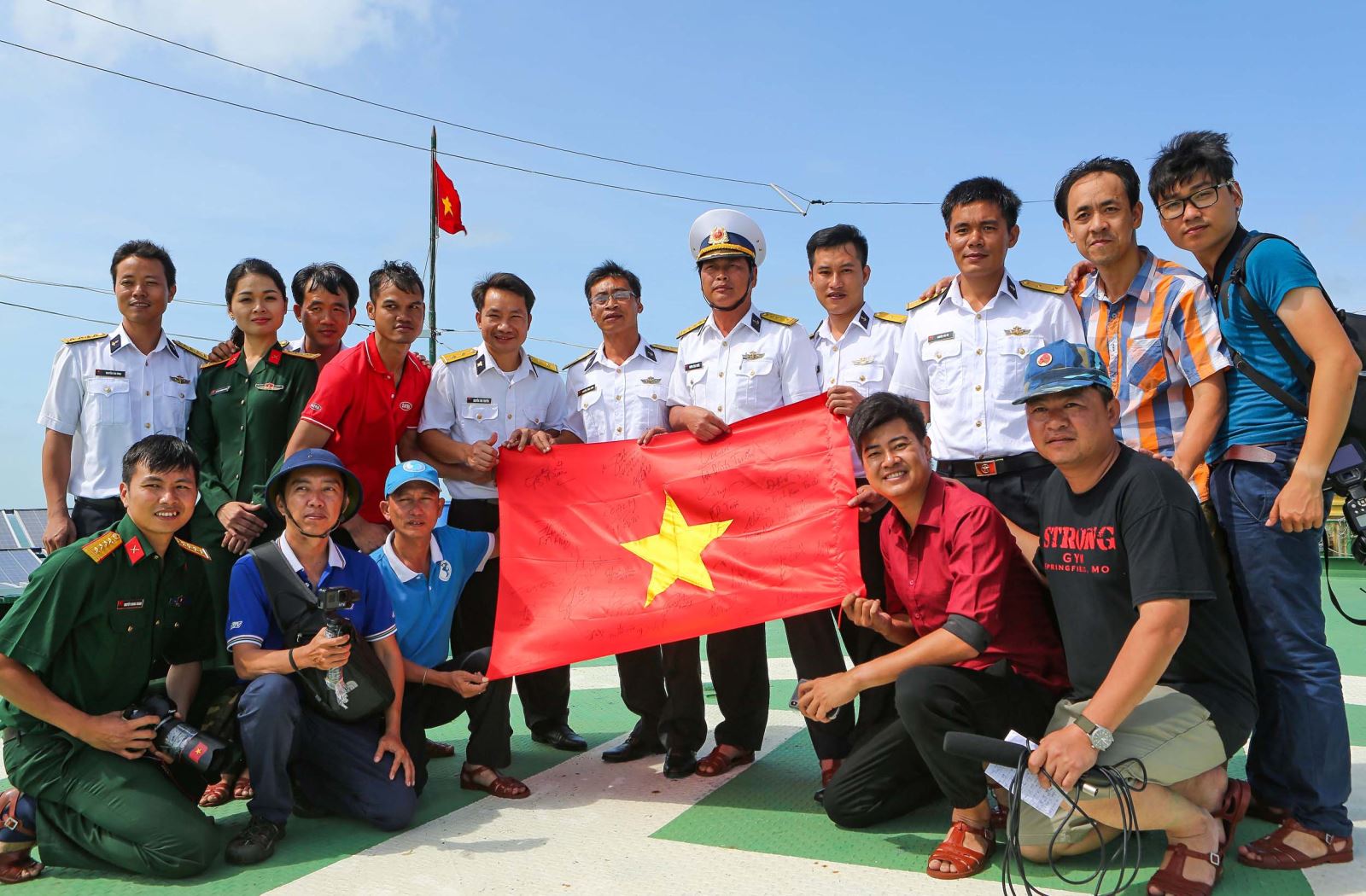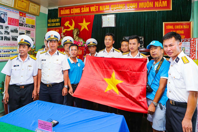 Lá cờ Tổ quốc có chữ ký của các cầu thủ Đội tuyển Bóng đá Việt Nam được các thành viên CLB Tuổi trẻ vì biển đảo quê hương chuyển đến cho các cán bộ, chiến sĩ Nhà giàn DK1.