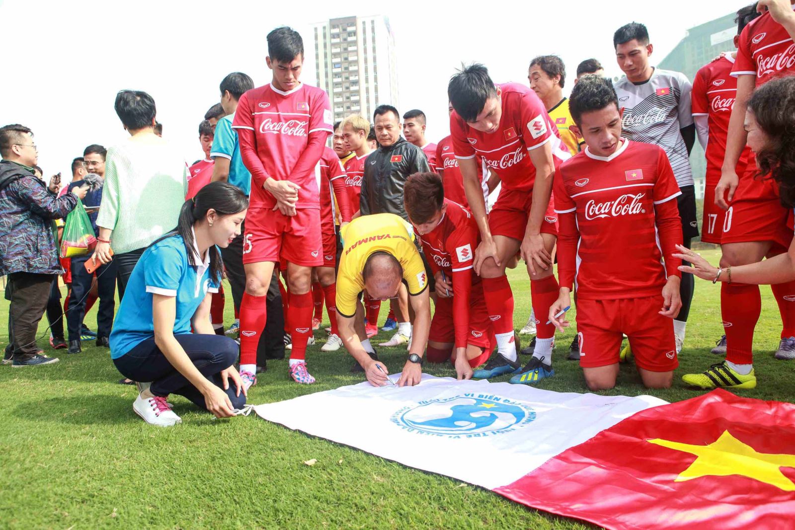 Huấn luyện viên trưởng Đội tuyển Bóng đá Việt Nam Park Hang Seo ký vào lá cờ của CLB Tuổi trẻ vì biển đảo quê hương và cờ Tổ quốc Việt Nam.