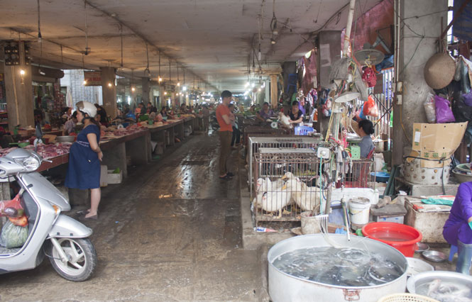 Động vật sống có thể mang mầm bệnh được bày bán chung với thực phẩm đã qua sở chế. (ảnh chụp tại chợ Đồng Quang, phường Quang Trung).