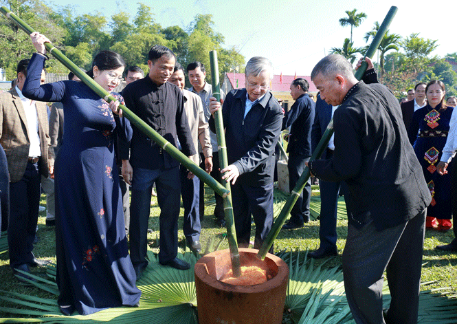 Đồng chí Trần Quốc Vượng, Ủy viên Bộ Chính trị, Thường trực Ban Bí thư và Đoàn công tác tham gia giã bánh dày tại Ngày hội Đại đoàn kết tại xóm Nạ Tẩm (Phú Đình, Định Hóa).