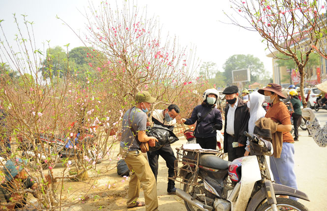 Người dân chọn mua đào ở Quảng trường Võ Nguyên Giáp.