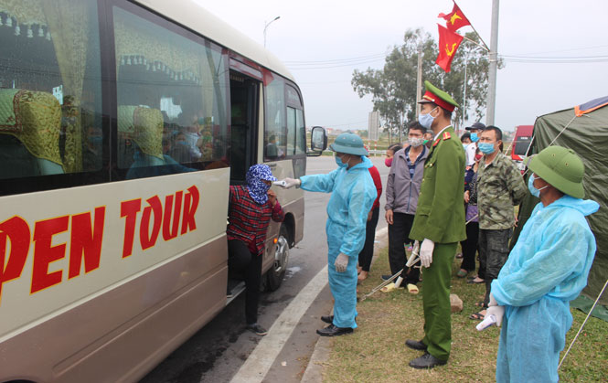Toàn tình hiện đã kích hoạt 28 chốt kiểm soát liên ngành phòng chống dịch COVID-19 tại các cửa ngõ tuyến đường vào tỉnh. Trong ảnh: Người dân được đo thân nhiệt và khai báo y tế khi đi qua chốt kiểm soát nút giao Yên Bình, ở xã Tân Hương, T.X Phổ Yên.