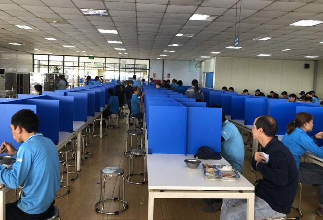 Tập đoàn Aluko ở Khu công nghiệp Điềm Thụy dựng vách ngăn tại khu vực nhà ăn ca để bảo vệ người lao động.