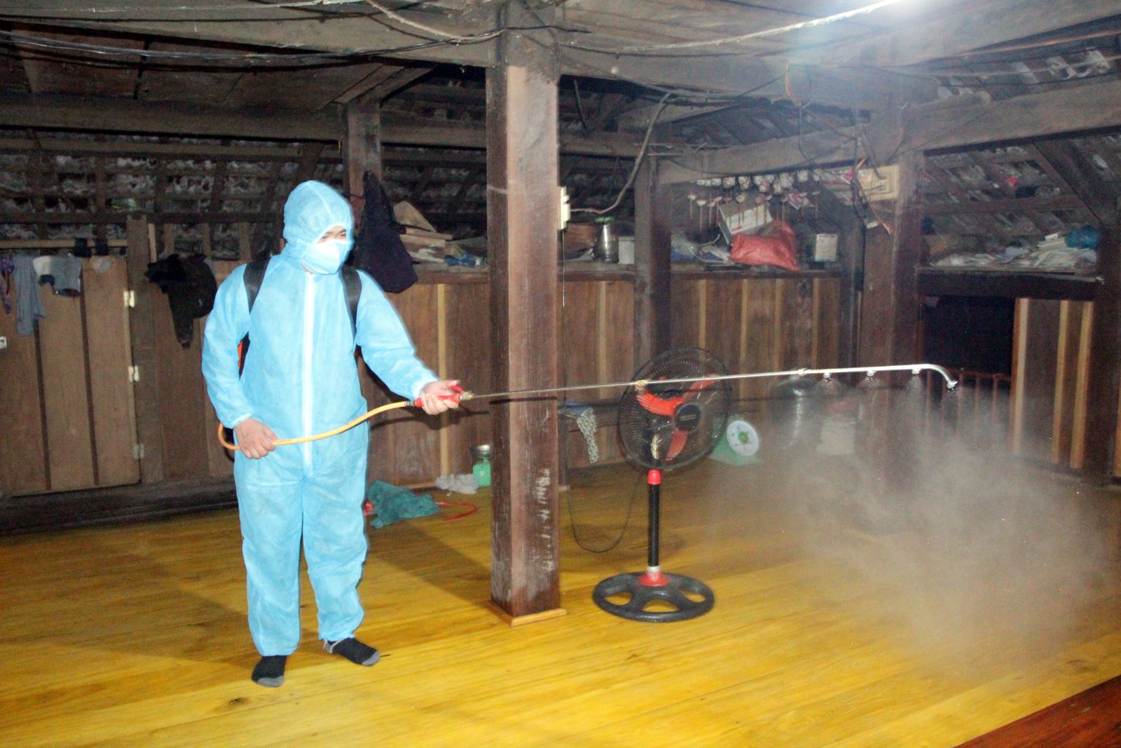 Anh Hoàng Huy Thiết, thành viên Tổ phản ứng nhanh phòng, chống dịch của xã Nghinh Tường (Võ Nhai) cùng mọi người khẩn trương phun thuốc khử khuẩn tại gia đình có người nhiễm COVID-19 ngay trong đêm 15-5.