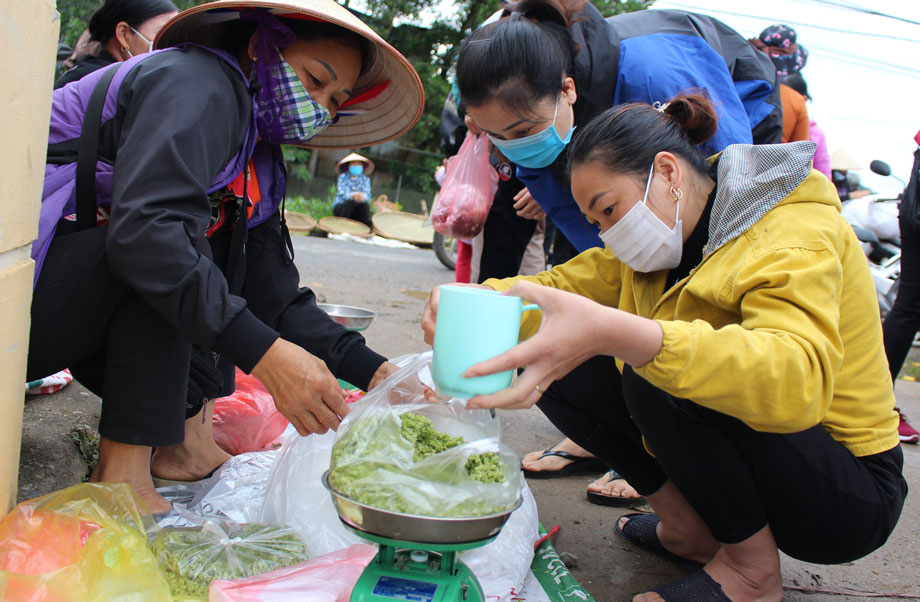 Hiện nay, cốm không chỉ nhằm phục vụ nhu cầu ăn uống trong gia đình mà đã trở thành hàng hoá được bày bán ở các phiên chợ trong và ngoài vùng. Vào đầu mùa, cốm có giá từ 60 đến 70 nghìn đồng/kg. Trong ảnh: Người dân mua cốm tại phiên chợ ở xã Hợp Thành (Phú Lương).