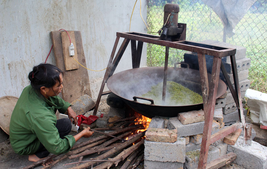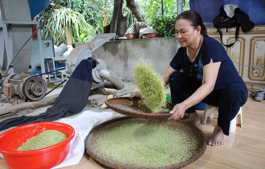 Hiện nay, cả 3 xã ở vùng Tam hợp có gần 60 hộ làm cốm thường xuyên để bán nhưng chiếm đa số là người dân ở xã Hợp Thành và Ôn Lương. Trong ảnh: Trung bình mỗi ngày, bà Trần Thị Thu, xã Ôn Lương sản xuất khoảng 50kg cốm.