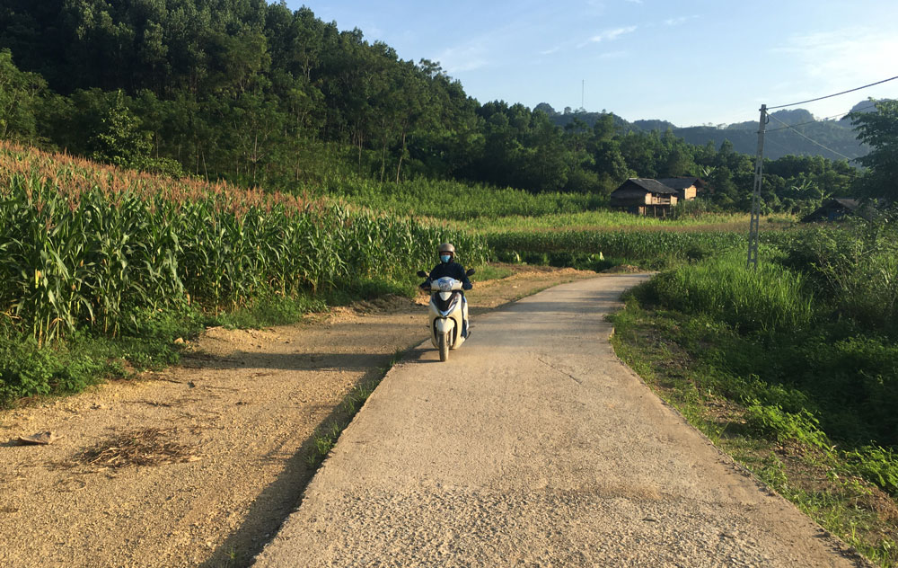 6 năm rồi chúng tôi mới có dịp trở lại Đồng Giong, xã Phương Giao (Võ Nhai). Đang thời điểm nâng cấp tuyến đường từ trung tâm xã vào bản nên con đường vào Đồng Giong khó như đường “lên trời” vậy. Nhiều đoạn lồi lõm, đất đá lổm nhổm như thử thách tay lái của chúng tôi. Dù vậy, không thể phủ nhận khung cảnh nơi rẻo cao này đẹp đến nao lòng với những nương ngô, rừng keo lai xanh ngút tầm mắt. Thích nhất là dãy núi đá vôi với tầng tầng, lớp lớp cây xanh ngả bóng trong nắng Thu thật nên thơ. Cả những ngôi nhà đơn sơ và nụ cười đôn hậu của người dân nơi đây cũng khiến chúng tôi cảm thấy ấm lòng.